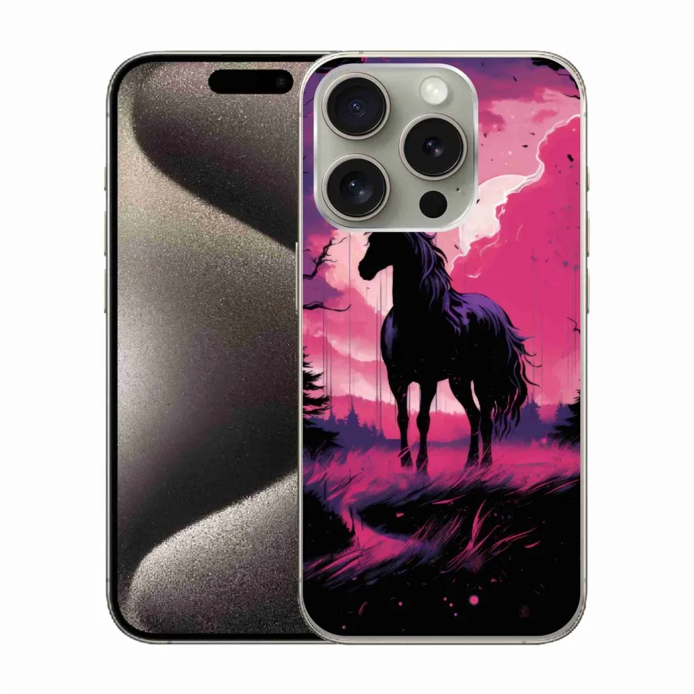 Rugalmas zselés tok mmCase képpel iPhone 15 Pro készülékhez - fekete rajzfilm ló 1