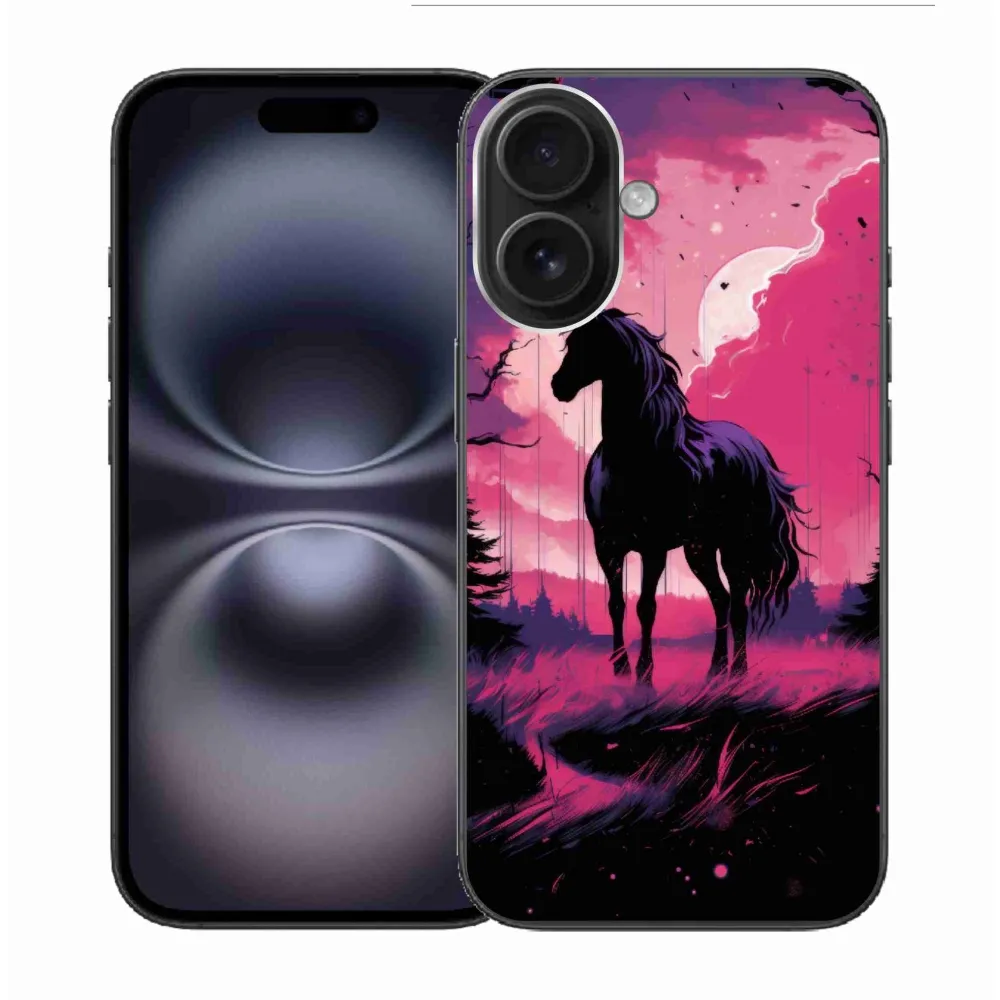 Rugalmas zselés tok mmCase képpel iPhone 16-hoz - fekete rajzfilm ló 1