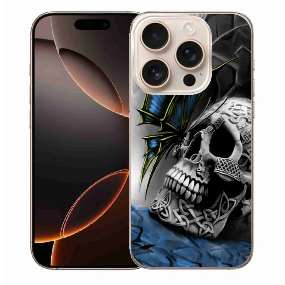 Rugalmas zselés tok mmCase képpel iPhone 16 Pro Max készülékhez - pillangó és koponya