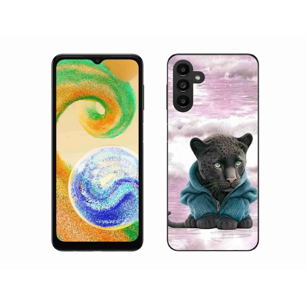 Rugalmas zselés tok mmCase képpel Samsung Galaxy A04s (164.7x76.7x9.1mm) - fekete párduc pulóverben - Samsung Galaxy A04s (164.7x76.7x9.1mm) számára